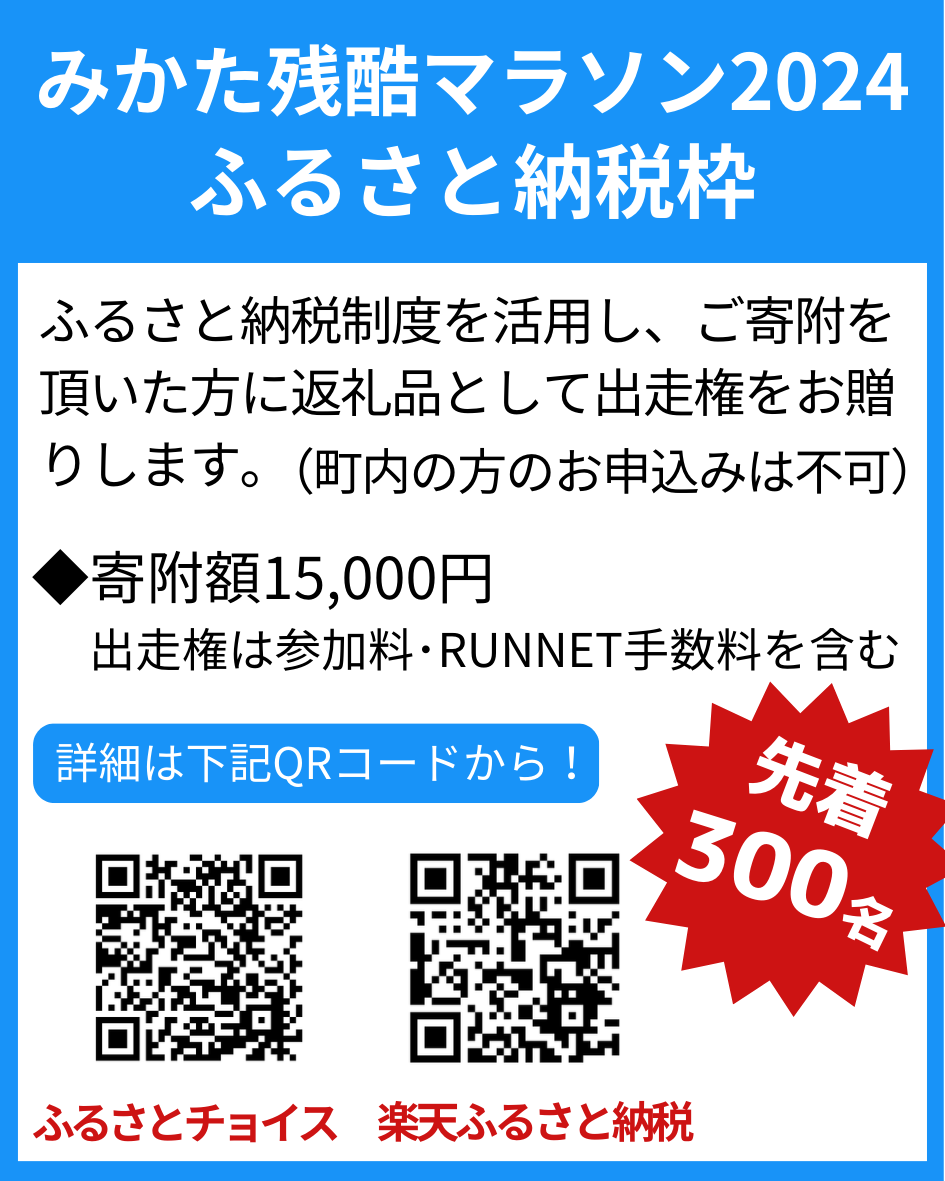 | 【2025情報】 | 2025年みかた残酷マラソン全国大会、お疲れ様でした!ご参加いただいた皆様、ご協力いただきました皆様、誠にありがとうございました! |